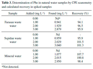Application In order to test the reliability of the proposed CPE-Scanometry method for extraction and determination of Phe in the water samples, three water samples including Farasan and Sepidan waste water and Sepidan mineral water were applied. No target analyte was found in these samples. To examine the relative recoveries, spiking Phe to the samples confirmed the validity of the procedure. Table 3 summarizes the results obtained for water samples. The recoveries are in the range 94.1-107.7%, indicating that the proposed method can be used successfully for the determination of Phe in water samples.