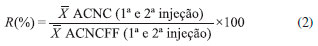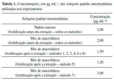 Métodos para extraçao das amostras Fortificaçao das amostras antes e após o processo de extraçao para avaliaçao da recuperaçao A fortificaçao inicial da amostra seguiu o mesmo processo em todos os métodos. Pesou-se 2 g da amostra em 4 tubos de centrífuga de 50 mL distintos, os quais foram identificados como amostra controle conforme fortificada com padrao interno (ACCPI), amostra controle nao conforme com fortificaçao no final (ACNCFF), amostra controle nao conforme 1 (ACNC1) e amostra controle nao conforme 2 (ACNC2). Um tubo de centrífuga de 50 mL para avaliaçao dos reagentes foi identificado como amostra controle branco de reagentes (ACBR). Aos tubos da ACBR e da ACNCFF foram adicionados 100 µL de MeOH. A ACCPI foi fortificada com 75 µL de MeOH e 25 µL da soluçao intermediária do padrao interno (ROX) a 2 µg mL-1. A ACNC1 e ACNC2 foram fortificadas com 50 µL de MeOH, 25 µL da soluçao intermediária do padrao interno e 25 µL da soluçao intermediária do mix de macrolídeos para fortificaçao da amostra no início do processo de extraçao a 2 µg mL-1. Após agitaçao em vortex por 10 s os tubos foram mantidos em repouso por 10 min. Métodos distintos de extraçao foram testados (métodos 1 a 8). Após os processos de extraçao, retirou-se 250 µL de sobrenadante de cada um dos tubos, transferiu-se para tubos de centrífuga de 15 mL e evaporou-se até a secura sob fluxo de N2, à temperatura máxima de 47 °C. Ressuspendeu-se o extrato seco da ACBR, ACCPI, ACNC1 e ACNC2 com 1 mL de MeOH:H2O (65:35, v/v), agitou-se em vortex por 15 s e filtrou-se a soluçao com filtro de PVDF de 0,22 µm para um vial. Nos métodos identificados como 1, 2, 3, 4, 6 e 8, paralelamente, ressuspendeu-se o extrato seco da ACNCFF com 1 mL da soluçao padrao intermediária com mix de macrolídeos para fortificaçao da amostra após processo de extraçao, agitou-se em vortex por 15 s e filtrou-se a soluçao com filtro de PVDF de 0,22 µm para um vial. O mesmo procedimento foi adotado para os extratos secos da ACNCFF dos métodos 5 e 7, entretanto a fortificaçao da mesma foi realizada com 1 mL das soluçoes padroes intermediárias com mix de macrolídeos para fortificaçao da amostra após o processo de extraçao com as concentraçoes especificas para esses métodos. Procedimentos de extraçao Os métodos descritos como 1, 2, 3, 4 e 8 foram baseados em ensaios desenvolvidos previamente no laboratório,19-23 enquanto os métodos 5, 6 e 7 basearam-se em métodos descritos por diversos autores, selecionados após levantamento bibliográfico.18,7,24 Método 1: ACN Adicionou-se a todos os tubos duas porçoes de 4 mL de ACN, com agitaçao por 1 min no agitador múltiplo após a adiçao de cada porçao. Agitou-se os tubos na mesa agitadora por 20 min, em velocidade de 240 rpm, e centrifugou-se a 4 °C, 5000 rpm, por 5 min. Método 2: ACN + 0,2 g de NaOAc + 0,8 g de MgSO4 (QuEChERS) Adicionou-se a todos os tubos duas porçoes de 4 mL de ACN, com agitaçao por 1 min no agitador múltiplo após a adiçao de cada porçao. Adicionou-se a cada tubo 0,2 g de NaOAc e 0,8 g de MgSO4. Agitou-se por 1 min no agitador múltiplo e centrifugou-se a 4 °C, 5000 rpm, por 5 min. Método 3: 0,1% (v/v) de FOA em ACN + 0,2 g de NaOAC + 0,8 g de MgSO4 (QuEChERS) Adicionou-se a todos os tubos duas porçoes de 4 mL de 0,1% (v/v) de FOA em ACN, com agitaçao por 1 min no agitador múltiplo após a adiçao de cada porçao. Adicionou-se a cada tubo 0,2 g de NaOAc e 0,8 g de MgSO4. Agitou-se por 1 min no agitador múltiplo e centrifugou-se a 4 °C, 5000 rpm, por 5 min. Método 4: ACN + 0,2 g de NaOAC + 0,8 g de MgSO4 + 200 mg de PSA (QuEChERS) Adicionou-se a todos os tubos duas porçoes de 4 mL de ACN, com agitaçao por 1 min no agitador múltiplo após a adiçao de cada porçao. Adicionou-se a cada tubo 0,2 g de NaOAc e 0,8 g de MgSO4. Agitou-se os tubos na mesa agitadora por 20 min, em velocidade de 240 rpm, e centrifugou-se a 4 °C, 5000 rpm, por 5 min. Para a limpeza dos extratos, de cada um dos tubos transferiu-se 2 mL do sobrenadante para tubos de centrífuga de 15 mL distintos contendo 200 mg de PSA. Agitou-se por 1 min no agitador múltiplo e centrifugou-se a 4 °C, 5000 rpm por 5 min. Método 5: 1% (v/v) de FOA em ACN Adicionou-se 2 mL de H2O aos tubos e agitou-se por 15 s. Posteriormente adicionou-se a todos os tubos duas porçoes de 4 mL de 1% (v/v) de FOA em ACN, com agitaçao por 1 min no agitador múltiplo após a adiçao de cada porçao. Agitou-se os tubos na mesa agitadora por 20 min, em velocidade de 240 rpm, e centrifugou-se a 4 °C, 5000 rpm, por 5 min. Método 6: 1% (v/v) de HOAc em ACN + 0,2 g de NaOAc + 0,8 g de MgSO4 (QuEChERS) Adicionou-se a todos os tubos duas porçoes de 4 mL de 1% (v/v) de HOAc em ACN, com agitaçao por 1 min no agitador múltiplo após a adiçao de cada porçao. Adicionou-se a cada tubo 0,2 g de NaOAc e 0,8 g de MgSO4. Agitou-se por 1 min no agitador múltiplo e centrifugou-se a 4 °C, 5000 rpm, por 5 min. Método 7: 1% (v/v) de HOAc em H2 O:ACN (16:84, v/v) + 2,4 g de Na2 SO4 + 0,58 g de NaOAc (QuEChERS) Adicionou-se a todos os tubos duas porçoes de 2 mL de 1% (v/v) de HOAc em H2O:ACN (16:84, v/v), com agitaçao por 1 min no agitador múltiplo após a adiçao de cada porçao. Adicionou-se a cada tubo 2,4 g de Na2SO4 e 0,58 g de NaOAc anidro. Agitou-se por 1 min no agitador múltiplo e centrifugou-se a 4 °C, 5000 rpm, por 5 min. Método 8: ACN + 0,8 g de Na2 SO4 + 0,2 g de NaCl + 0,4 g de K2 CO3 (QuEChERS) Adicionou-se a todos os tubos duas porçoes de 4 mL de ACN, com agitaçao por 1 min no agitador múltiplo após a adiçao de cada porçao. Adicionou-se a cada tubo 0,8 g de Na2SO4, 0,2 g de NaCl e 0,4 g de K2CO3. Agitou-se por 1 min no agitador múltiplo e centrifugou-se a 4 °C, 5000 rpm, por 5 min. Avaliaçao dos métodos Os métodos com melhores recuperaçoes globais (Rglobal) dos analitos e menores desvios padroes relativos (RSD) foram selecionados. Para os cálculos da Rg