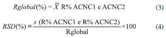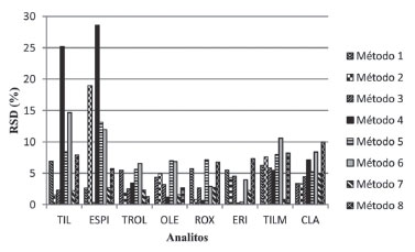 ![]() Figura 3. Desvio padrao relativo, RSD(%), entre ACNC1 e ACNC2 nos métodos 1, 2, 3, 4, 5, 6, 7 e 8