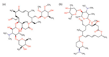![]() Figura 1. Estrutura química de dois dos principais macrolídeos empregados na medicina veterinária. (a) tilosina, (b) espiramicina11
