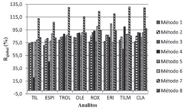 ![]() Figura 2. Rglobal(%) dos analitos nos métodos 1, 2, 3, 4, 5, 6, 7 e 8