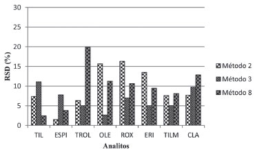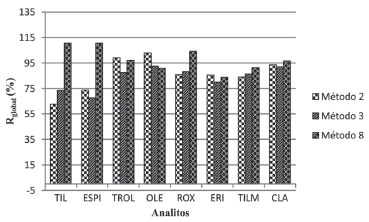 ![]() Figura 4. Rglobal(%) dos analitos nos métodos 2, 3 e 8