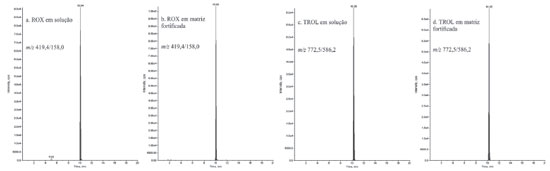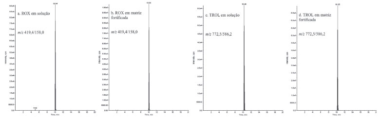 Após a realizaçao de novos ensaios, observou-se que os métodos 2 e 8 apresentaram grandes variaçoes entre o primeiro e o segundo dia de ensaio, com valores de RSD de até 16% (ROX) e de até 20% (TROL), respectivamente para os métodos 2 e 8 no segundo dia de ensaio e Rglobal (> 100%) para as substâncias TIL, ESPI e ROX no segundo dia de ensaio no método 8. O método 3 apresentou os melhores valores de Rglobal e RSD, além de menor variaçao entre o primeiro e segundo dia de ensaios realizados, exceto para ESPI e TILM, demonstrando melhor precisao. A Figura 6 exibe os cromatogramas de íons extraídos referentes às transiçoes de quantificaçao da ROX e TROL em soluçao a 1,5 ng mL-1 (a, c) e na matriz fortificada (b, d) em concentraçao equivalente (25 µg kg-1) no método de extraçao 3.