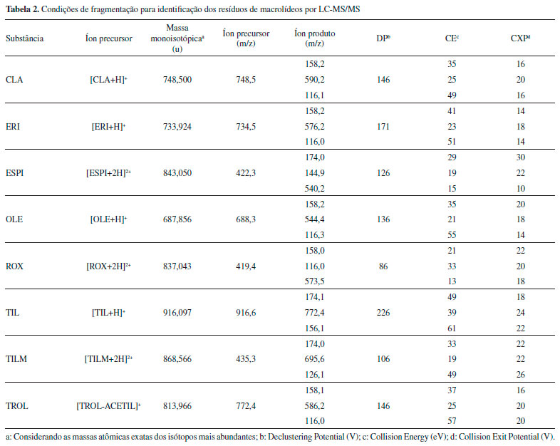 | Avaliação de diferentes métodos de extração para a identificação de resíduos de macrolídeos em alimentos infantis industrializados à base de carne por cromatografia a líquido acoplada à espectrometria de massas sequencial (lc-ms/ms) Evaluation of different extraction methods for identification of macrolides residues in meat-based canned baby food by liquid chromatography-tandem mass spectrometry (lc-ms/ms) |