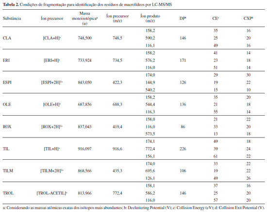 Instituto Nacional de Controle de Qualidade em Saúde, Fundação Oswaldo Cruz, Rio de Janeiro - RJ, Brasil Recebido em: 02/03/2018 *e-mail: jvgrutes@gmail.com The interest in a better quality of life raised the concern about food safety. The administration of veterinary drugs in livestock may lead the occurrence of residues in food that may be harmful to consumers. Processed products are being consumed more and more, which increases concern for the safety of infants and children because they are more susceptible physiologically. Among these products stand out canned baby foods, defined by Ordinance 34/1998 issued by Brazilian Ministry of Health. Eggs and meat-based salty products for infants and children, legally designated as soups, fit into this definition and can not contain residues of hormones, antibiotics, as well as other pharmacologically active substances. Several techniques are used as identification and confirmatory assays of veterinary drug residues in food, although the main used technique is liquid chromatography - tandem mass spectrometry (LC-MS/MS). The aim of this work was to make a comparative assessment between different extraction methods in order to establish the best condition within the tested ones for the identification of macrolide residues in meat-based canned baby food by LC-MS/MS. A simple and effective extraction method, with good recoveries (65-93%) and satisfactory relative standard deviations (0.4-11%), was achieved using QuEChERS procedure for sample preparation. INTRODUÇAO Nos dias de hoje é cada vez maior a preocupaçao com a segurança dos alimentos, sobretudo devido à busca da sociedade por uma melhor qualidade de vida.1 Sabe-se que os medicamentos veterinários ocupam papel significativo no incremento da produçao no setor pecuário.2 Entretanto, a contaminaçao química devido à essa utilizaçao pode se tornar um grande problema para a saúde dos consumidores devido à presença dos resíduos de medicamentos veterinários, definidos como todos os compostos ou seus metabólitos presentes em qualquer porçao comestível de um produto de origem animal.3,4 Diversos órgaos de regulamentaçao estabelecem Limites Máximos de Resíduos (LMR) permitidos para alimentos. Concentraçoes acima desses LMR para substâncias autorizadas e a presença de substâncias proibidas podem elevar as chances do desenvolvimento de reaçoes alérgicas, discrasias sanguíneas e carcinogenicidade nos consumidores. Além disso, no caso dos antimicrobianos, mesmo concentraçoes abaixo desses limites podem induzir o surgimento de bactérias resistentes.5 Ressalta-se que os efeitos prejudiciais à saúde anteriormente citados podem ser ainda mais pronunciados em lactentes (crianças de zero a doze meses incompletos) e crianças de primeira infância (crianças de um a três anos),6 tanto por serem mais suscetíveis fisiologicamente, quanto por estarem, proporcionalmente, mais expostos aos alimentos do que adultos, levando-se em consideraçao a taxa de consumo por unidade de peso.7 Inseridos no contexto dos antimicrobianos de uso veterinário, os macrolídeos se destacam devido à sua ampla utilizaçao na pecuária no tratamento de micoplasmose, doença digestiva hemorrágica, infecçoes respiratórias e abscessos hepáticos, e por serem classificados como criticamente importantes para a induçao do surgimento de bactérias resistentes pela Organizaçao Mundial da Saúde e Organizaçao Mundial de Saúde Animal.8,9 Os macrolídeos se caracterizam por apresentarem em suas estruturas químicas um anel lactona macrocíclico contendo 14 (eritromicina, roxitromicina, claritromicina, oleandomicina e troleandomicina), 15 (azitromicina) ou 16 (espiramicina, tilosina e tilmicosina) átomos de carbono, com moléculas de açúcares ligadas por ligaçoes glicosídicas.10 A Figura 1 apresenta as estruturas químicas da tilosina e da espiramicina, respectivamente, dois dos principais macrolídeos empregados na medicina veterinária.