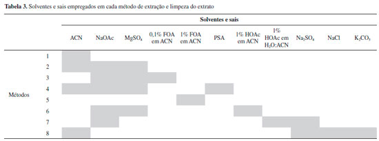 RESULTADOS E DISCUSSAO Avaliaçao comparativa dos métodos de extraçao Os alimentos infantis industrializados (sopas) à base de carnes sao matrizes complexas, com alto teor de proteínas, lipídeos e também de carboidratos quando legumes estao presentes na formulaçao. Portanto, sao necessárias etapas de limpeza das amostras antes da identificaçao dos analitos por LC-MS/MS. Os métodos se diferenciaram basicamente pelos solventes e sais utilizados para a extraçao, os quais estao descritos na Tabela 3.