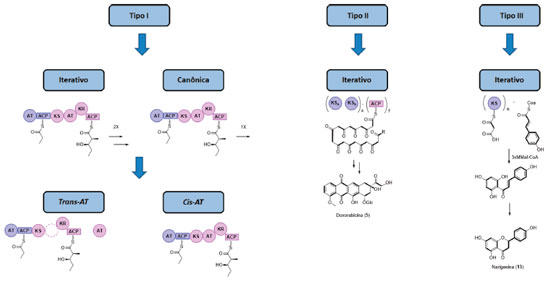Figura 3. Classificaçao das sintases de policetídeos com relaçao a sua estrutura (tipo I, tipo II e tipo III), do modo de condensaçao dos substratos (iterativo ou canônico) e com relaçao a colinearidade dos domínios AT (trans-AT ou cis-AT)