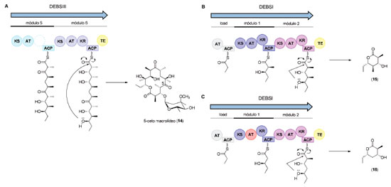 PRIMEIRAS EXPERIENCIAS UTILIZANDO A BIOSSINTESE COMBINATORIA EM POLICETIDEOS Inicialmente, a biossíntese combinatória foi realizada em policetídeos microbianos visando estudar principalmente PKSs bem estabelecidas e que se utilizavam de substratos simples da via metabólica do acetato, como malonatos, propanoatos e derivados. O que realmente incitou os pesquisadores foi a linearidade (módulos e domínios) presente na "montagem" das PKSs do tipo I. Essa característica modular propiciou uma série de pesquisas envolvendo a manipulaçao genética desses módulos na tentativa de promover alteraçoes estruturais nos esqueletos dos policetídeos. A primeira demonstraçao da viabilidade de engenharia genética para a produçao de macrolídeos estruturalmente modificados foi apresentada pelo grupo do Katz,20 que inibiu o domínio de KR, presente no módulo 5, por alteraçao da sequência primária, levando ao produto 5-ceto (14) em vez do original 5-hidróxi. Esse novo produto nao apresentou atividade antibiótica, mas experimentalmente forneceu a primeira evidência de que novos produtos naturais policetídicos poderiam ser produzidos por engenharia genética (Figura 5A).