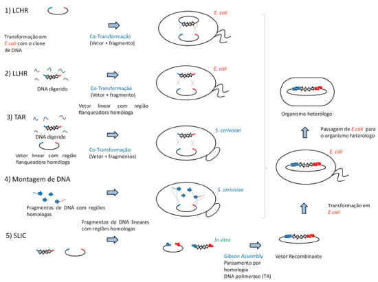 Figura 13. Metodologias de recombinaçao para clonagem de vias biossintéticas (adaptado de Kim e colaboradores)4