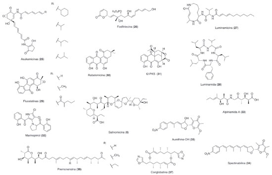 Figura 14. Estruturas de produtos naturais produzidos por expressao heteróloga ou manipulaçao de vias biossintética orientado principalmente para produçao de policetídeos