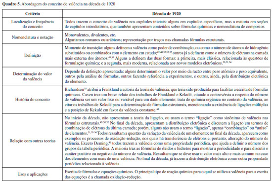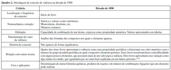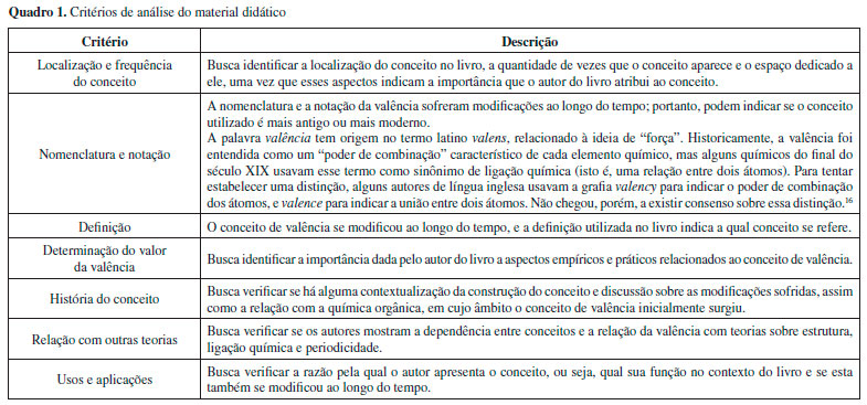 A análise dos livros foi feita de acordo com critérios propostos a partir de leituras preliminares do material, descritos no Quadro 1. Esses critérios se voltam para a investigaçao da natureza do conceito de valência, a presença ou ausência da história do conceito, qual a abordagem e a relevância dada ao conceito, e qual a posiçao em que o conceito se encontra no texto em relaçao a outros conceitos relacionados (como a tabela periódica dos elementos, por exemplo). Nesse processo, se procurou investigar as mudanças nos livros didáticos e suas relaçoes com mudanças na própria ciência química durante as primeiras décadas do século XX.