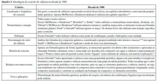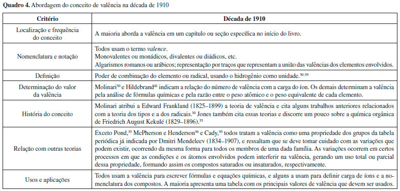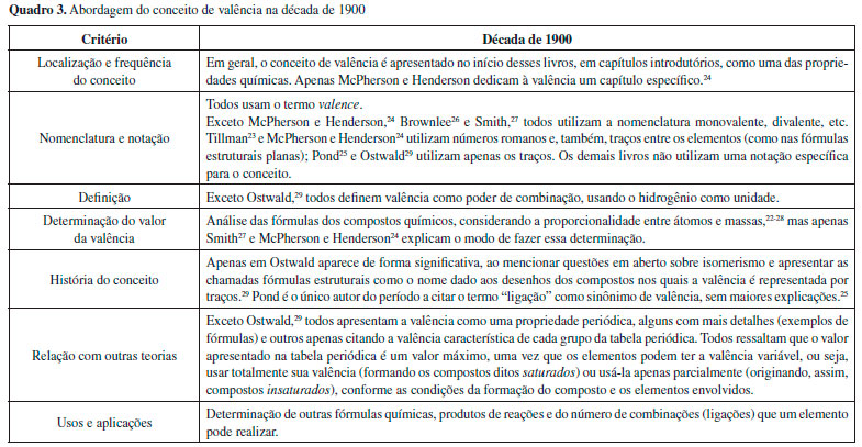 De modo geral, os livros da década de 1890 apresentam a valência como uma propriedade numérica e periódica dos elementos químicos, a qual indica a capacidade de combinaçao dos respectivos átomos, sendo apresentada no início do livro entre outros conceitos básicos, e é indicada por números romanos. Desse período foi analisado em maior profundidade o livro de Attfield,17 por ser o livro mais antigo e mostrar uma visao peculiar da química. Logo no prefácio, o autor enumera as razoes pelas quais se deve ensinar e estudar química: segundo Attfield (p. viii), a química é um "instrumento da cultura mental", que aguça e expande o poder da observaçao, amplia e fortalece a memória e a imaginaçao, desenvolve e elabora o pensamento e a razao.17 Nesse livro, o conceito de valência é apresentado no capítulo 4, intitulado "Os princípios gerais da filosofia química". A valência é definida como o "valor" do átomo, de forma análoga aos valores de moedas e notas. O autor ressalta que há vários nomes para esse conceito, sendo que ele opta por quantivalence ou valency. Attfield também destaca que esse conceito nao está relacionado com a intensidade da uniao dos átomos nem com a estabilidade de compostos, e que os valores das valências devem ser decorados para facilitar a escrita correta de fórmulas, e para isso sao fornecidos valores em tabelas. Por fim, Attfield apresenta elementos com mais de uma valência, como o ferro, observando que, naquele momento, nao havia uma explicaçao científica para tal fato.17 Dois aspectos do livro de Attfield chamam a atençao. O autor enfatiza bastante o fato de a química trabalhar com modelos - como os de átomo e as fórmulas estruturais dos compostos - que sao entes hipotéticos e nao objetos reais. Outro aspecto observado é que o autor usa vários termos para o conceito de valência, nomeado ao longo da obra como quantivalence, valency e valence, de forma indiscriminada e, às vezes, em uma mesma seçao.17 Anos 1900 Desse período, foram analisados os seguintes livros: Fetterolf (1900), Tillman (1904), McPherson e Henderson (1906), Pond (1906), Brownlee (1907), Smith (1908), Baskerville (1909) e Ostwald (1909).22-29 O Quadro 3 sumariza as características observadas nesse conjunto de livros.