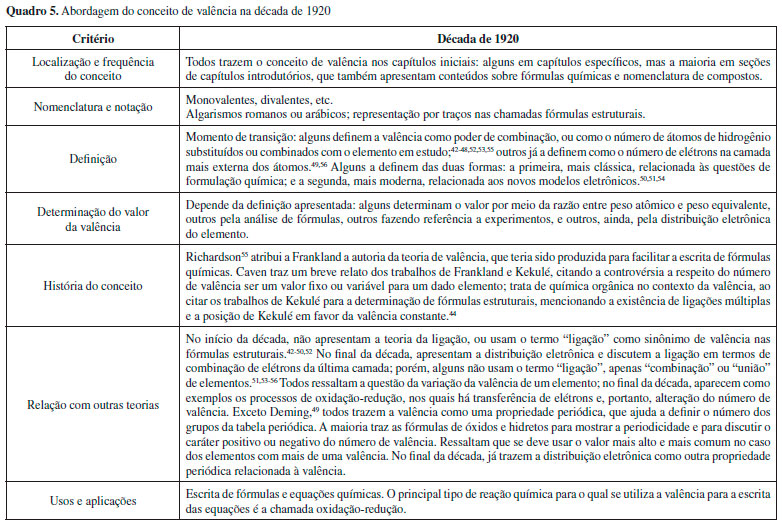 Com essa afirmaçao o autor faz uso da história da química de uma forma bem característica da época, ou seja, exaltando grandes cientistas e os feitos da ciência. De qualquer forma, Molinari registra que a valência teve sua origem no âmbito da química orgânica. Depois dessa introduçao histórica, o autor define valência como a capacidade de saturaçao de combinaçao de um elemento. Molinari a diferencia de afinidade, afirmando que a valência é uma propriedade quantitativa e nao qualitativa, sendo determinada por uma fórmula matemática: a razao entre o peso atômico e o peso equivalente no composto estudado.30 Por fim, cabe ressaltar que Molinari relaciona a valência de um elemento com a carga do respectivo íon; e relaciona essa carga com a quantidade de elétrons no átomo. O autor menciona a valência variável como uma característica dos compostos inorgânicos, nos quais os elementos apresentam diferentes graus de saturaçao e, portanto, possuem uma valência máxima que nem sempre é utilizada em sua totalidade.30 Anos 1920 Foram analisados os seguintes livros desse período: McCoy e Terry (1920), Brownlee (1921), Caven (1921), McPherson e Henderson (1921), Holmes (1922, 1925), Deming (1923, 1925), Foster (1924), Schlesinger (1925), Brinkley (1926), Kendall (1927), McCutcheon e Seltz (1927), Richardson (1927) e Babor (1929).42-56 O Quadro 5 sumariza as características observadas nesse conjunto de livros.