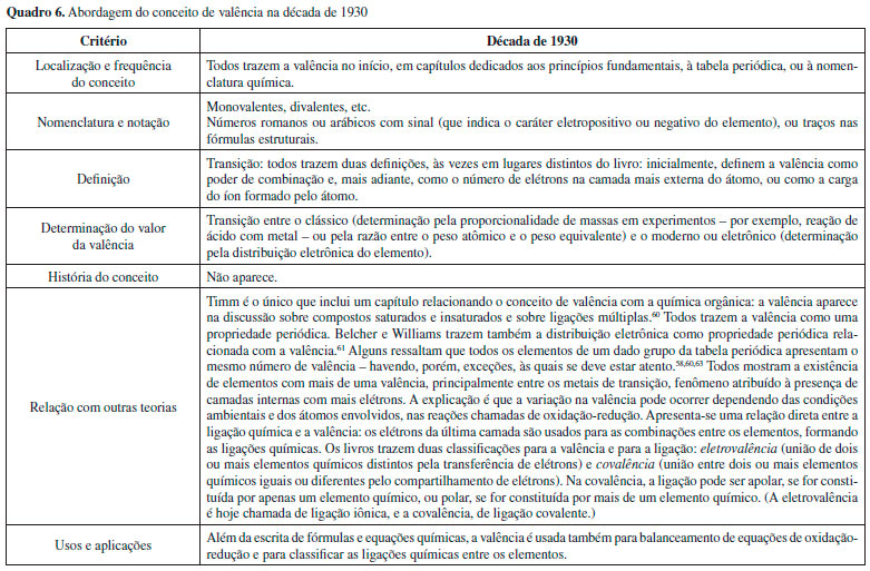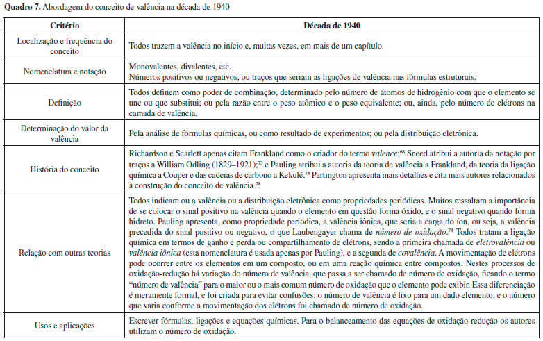Mais adiante no livro, a valência é retomada como uma propriedade periódica (capítulo 16), e ressignificada com a definiçao eletrônica (capítulo 18). Timm entao apresenta a valência como a quantidade de elétrons da última camada eletrônica de um átomo, mas ressalva que há processos que envolvem perda e ganho de elétrons, os quais alteram o valor dessa propriedade nos produtos das reaçoes. Além disso, há compostos nos quais elétrons de camadas mais internas também podem ser utilizados, o que também leva a uma alteraçao no número de valência do elemento. Além de trazer essa nova definiçao, Timm aborda as reaçoes de oxidaçao-reduçao de forma aprofundada, e sumariza o que ele chama de "natureza da valência". Esse resumo se assemelha muito às regras de utilizaçao dos números de oxidaçao, utilizados no ensino de química na atualidade, e inclui os seguintes pontos: valência é igual à carga elétrica do átomo; valência é igual a zero para elementos nao combinados; valência é positiva para metais e negativa para ametais, com exceçao de ametais ligados a oxigênio, que possuem valência positiva; a variaçao da valência está ligada ao número de elétrons perdidos ou recebidos no processo; e a soma dos números de valência é nula para compostos, ou igual à carga para íons. Essa relaçao com a carga do íon é retomada nos capítulos específicos sobre dissociaçao eletrolítica e eletrólitos (capítulos 26 e 27).60 Anos 1940 Foram analisados os seguintes livros desse período: Babor e Lehrman (1940), Richardson e Scarlett (1940), Young e Porter (1940), Brinkley (1941), MIT (1943), Deming (1944), Sneed (1944), Partington (1966; 1ª. ed., 1946), Pauling (1947), Currier e Rose (1948), Laubengayer (1949) e Sisler, Van der Werf e Davidson (1949).67-78 O Quadro 7 sumariza as características observadas nesse conjunto de livros.