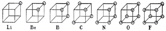 Figura 8. Modelos de Lewis para os "átomos cúbicos", mostrando o número de elétrons na camada externa de alguns átomos (reproduzido da ref. 50, p. 767)