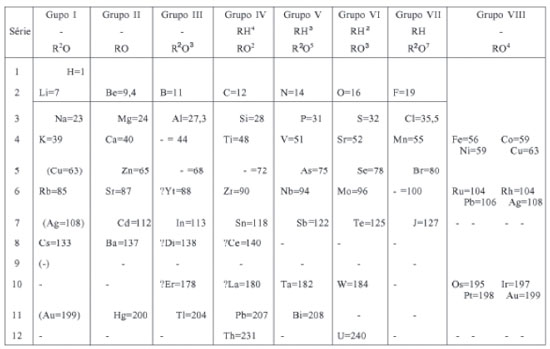 PERIODICIDADE QUIMICA E VALENCIA Muitos livros didáticos mencionam a valência como uma propriedade periódica identificada por Mendeleev. Essa ideia é apontada por Palmer26 como verdade para as séries curtas da tabela periódica, mas nao para as séries longas, que incluem os chamados metais de transiçao e os lantanoides e actinoides - estes, entretanto, nao estavam presentes na tabela original de Mendeleev. Williamson classificou os elementos de acordo com suas valências, e Frankland aperfeiçoou essa classificaçao usando o maior número de valência conhecido para cada elemento, incluindo dessa forma os elementos com valência variável. Em sua tabela periódica, Mendeleev havia indicado, para cada grupo da tabela, uma fórmula geral para os compostos que eles formavam com o oxigênio ou com o hidrogênio, elementos mais comuns e com maior número de compostos conhecidos na época. Essa fórmula geral aparecia no topo das colunas,25,30,52 como se observa na Figura 11, que reproduz uma tabela periódica de 1871. Na segunda metade do século XIX, as fórmulas eram obtidas por meio das valências, ou a valência era obtida pela composiçao que dava origem à fórmula. Entretanto, a existência de valências múltiplas para um mesmo elemento poderia levar a seu questionamento como propriedade periódica, pois as valências múltiplas nao variavam de forma regular.25