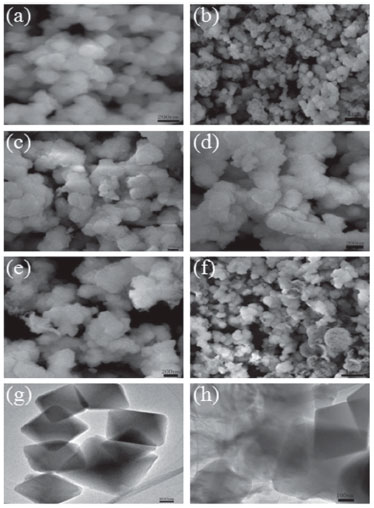 SEM and TEM measurements The morphology of NH2-UiO-66 and the NH2-UiO-66(Ti) nanocomposite were investigated by SEM. According to Figure 7, it can be clearly seen from (a) that NH2-UiO-66 nanocrystals were more angular, revealing the increased definition of facets and vertices that are common in larger crystals, indicating that the presence of the NH2 group on the organic linker affects the growth mechanism of the framework.33 The materials have the typical octahedral morphology, with homogeneous particle diameters about 200 nm. Obviously, NH2-UiO-66(Ti) retained the similar morphology as NH2-UiO-66.Furthermore, no obvious differences of the morphologies could be observed from the TEM images (g and h). These observations suggest that Ti was truly incorporated into the UiO-66 framework to replace Zr as skeleton.34 No change in the octahedral morphology of the crystals could be observed. Furthermore, EDS elemental analysis was also conducted to study the elemental distribution. The EDS spectrum of NH2-UiO-66(Ti) reveals N, Zr, Ti, and O elements.