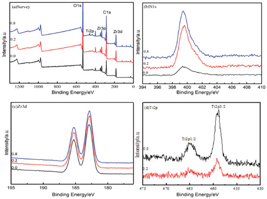 XPS measurements The X-ray photoelectron spectroscopy (XPS) is a highly sensitive technique to explore the chemical changes in the element surroundings. The XPS spectra of the elements of interest Zr3d, Ti2p, N1s, O1s are shown in Figure 6.The survey scan of the NH2-UiO-66 and NH2-UiO-66(Ti) was shown in Figure 6(a), new peaks associated with Ti2p appeared in the XPS spectrum of the UiO-66(Ti) composites, and their relative peak intensities to that of Zr3p increased with an increasing Ti content. These observations confirmed that the titanium moieties were successfully.The analysis Figure 6(c) of NH2-UiO-66(Ti) indicated a small shift in the binding energy of the Zr3d peaks (from 185.08 and 182.78 eV to 185.28 and 182.88eV,respectively).31 Figure 6(d) shows two peaks of the Ti2p region at 458.7 eV and 464.5 eV,corresponding to Ti2p3/2 and Ti2p1/2 respectively, The increasing Ti contents could be explained by the enhanced electron density around the O atoms. All these features imply that the titanium moieties be introduced to the framework of UiO-66 as electron donor via the formation of oxo-bridged hetero-Zr-Ti clusters.and provided that another confirmation of the successful incorporation of the Ti moiety in NH2-UiO-66.32