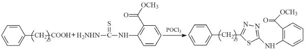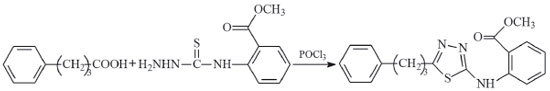 METHODS Experimental process 5-[3-Phenylypropyl]-N-[2'-methoxycarbonylphenyl]-1,3,4-thiadiazol-2-amine (compound I) The synthesis of compound I is shown in Figure 1. In the experimental process, 4-phenylbutyric acid (3.53 g, 10 mmol) and N-(2-methoxycarbonylphenyl)thiosemicarbazide(2.25 g, 10 mmol) were mixed and placed in a refrigerator at 4 °C for 2 h. Subsequently, POCl3 (0.96 mL, 30 mmol) was added dropwise to the cold mixture during stirring. Reflux was continued at 90 °C for 2 h. After the reaction was completed (followed by thin layer chromatography (TLC) by comparing with the raw material), the mixture was cooled to room temperature and added into the stirred ice-cold water. The mixture was then neutralised (pH≈8) using an ammonia solution (10%). The precipitated product was filtered, washed using distilled water and recrystallized from tetrahydrofuran (THF). (Yield: 86%, melting point: 107 °C). Elemental analysis (C19H19N3O2S): theoretical (%): C, 64.57; H, 5.42; N, 11.89; experimental (%): C, 64.63; H, 5.47; N, 12.17.
