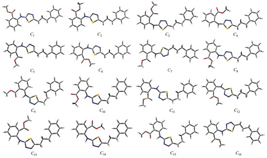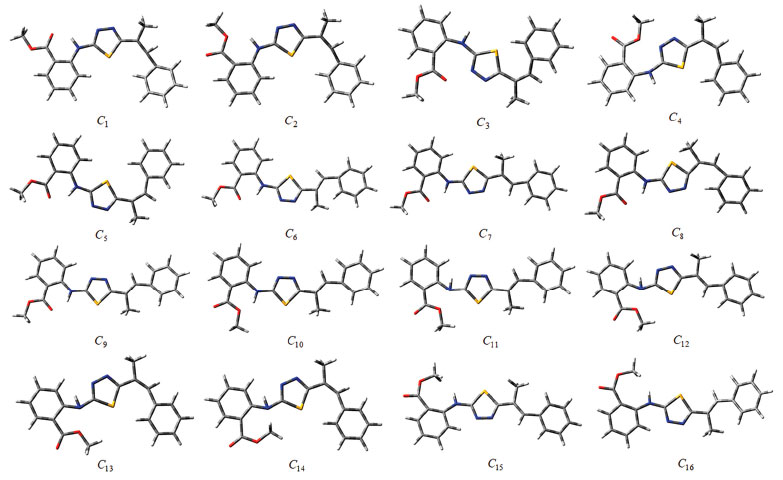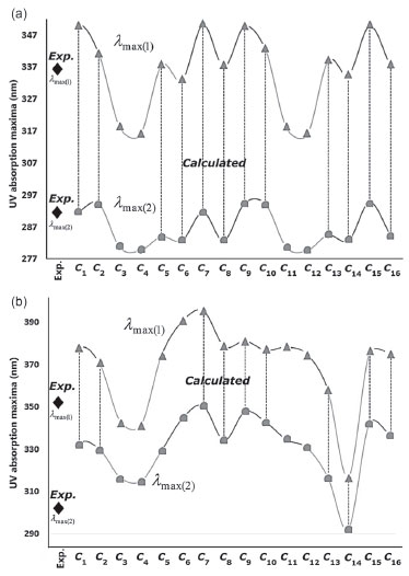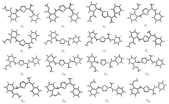 Computational details Although the conformational flexibility and diversity of the synthesised compounds are considerable, 16 initial conformations were selected for each compound (Figures 4 and 5). Kohn-Sham density functional theory (KS-DFT) was employed in the quantum-chemical calculations. No geometric constraints were introduced in the optimisation processes. The conformers were optimised to obtain ground state geometries using the Becke3-Lee-Yang-Parr hybrid exchange-correlation function (B3LYP)26,27 with the 6-311++g(2d,2p) basis set. Furthermore, these methods were also employed for obtaining the optimised molecular conformations and UV, IR and NMR spectra of the conformers. Time-dependent DFT (TD-DFT) was employed to calculate vertical excitation energies. The Self-Consistent Reaction Field (SCRF) method and the Conductor-Polarizable Continuum Model (CPCM) were used for UV spectral analysis in the chloroform phase. IR calculations were also performed in the gas phase, and saddle-point configurations were excluded. In other words, all vibration modes in the calculated IR spectra of the conformers were real, indicating the presence of the local energy minima of the conformers. Moreover, 1H-NMR calculations of the conformers were performed in the dimethyl sulfoxide (DMSO) phase using the same method and basis set.