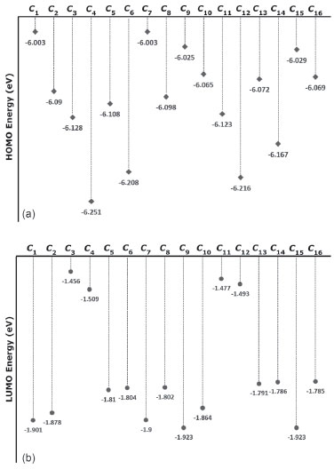 ![]() Figure 6. a) HOMO energy eigenvalues of the conformers of compound I. b) LUMO energy eigenvalues of the conformers of compound I