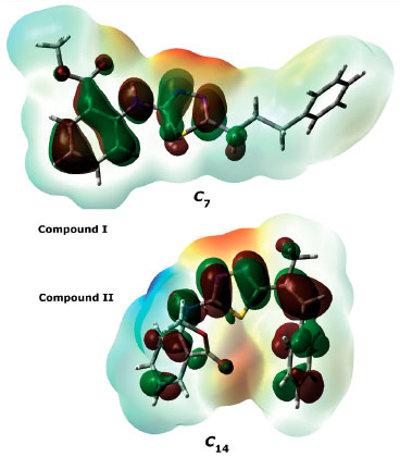 ![]() Figure 7. HOMO and ESP maps of compounds I-𝓒;7 and II-𝓒;14.