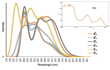 ![]() Figure 8. Experimental and calculated UV spectra of the conformers 𝓒;2, 𝓒;3, 𝓒;9, 𝓒;13, 𝓒;14 and 𝓒;16 of compound I