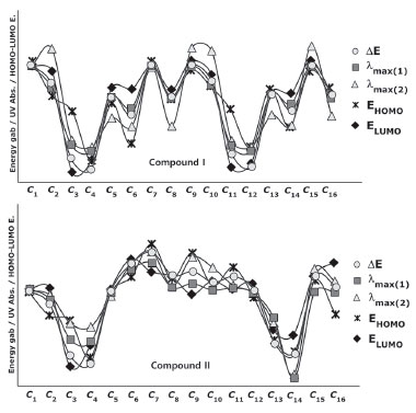 One distinctive feature of the conformers𝓒;1, 𝓒;7, 𝓒;9 and 𝓒;15 of compound I, which had the lowest molecular energy (E𝓒;7 < E𝓒;9 < E𝓒;15 < E𝓒;7 < E𝓒;1 < ... < E𝓒;16), was that they formed a hydrogen bond between O39 and H16 (see Supplementary Material). Moreover, λmax (1) of these conformers was calculated to be around 350 nm and larger than the other conformers. A similar relation was also observed between 𝓒;2, 𝓒;8, 𝓒;10 and 𝓒;16, wherein the hydrogen (-NH) and oxygen (OCH3) formed a hydrogen bond. These conformers also had lower minimum energies and gave absorption peaks close to the experimental results. Conformers giving low UV absorption peaks were also found to have larger molecular energies than the others. If we summarise the relationship between the molecular energy and UV absorption, although the minimum molecular energies of the conformers having strong interactions (NH->C=O and-NH-OCH3) were calculated to be small, their UV absorption peaks were shifted to longer wavelengths (bathochromic shift). A similar situation was also observed for the conformers of compound II. Figure 10 shows a graphical comparison of the scaled data of ΔE, UV absorption maxima and HOMO and LUMO energies of the conformers of compounds I and II. It was shown that the absorption wavelength peaks were closely related to the E, EHOMO and ELUMO energies as well as to ΔE.