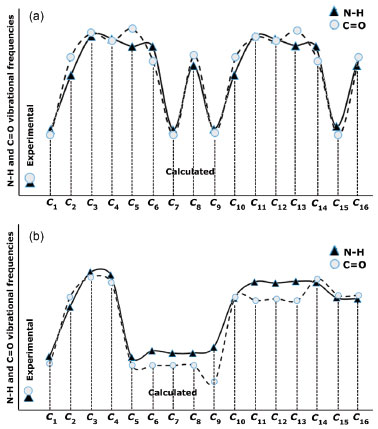 ![]() Figure 11. Experimental and theoretical data of the N-H and C=O vibrations of a) compound I and b) compound II (values are scaled)