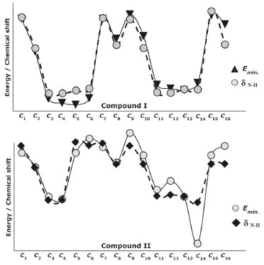 ![]() Figure 12. Representation of the correlation between the minimum molecular energies Emin. and the -NH chemical shifts (δN-H) of the conformers of compounds I and II (values are scaled)