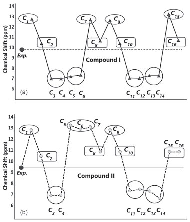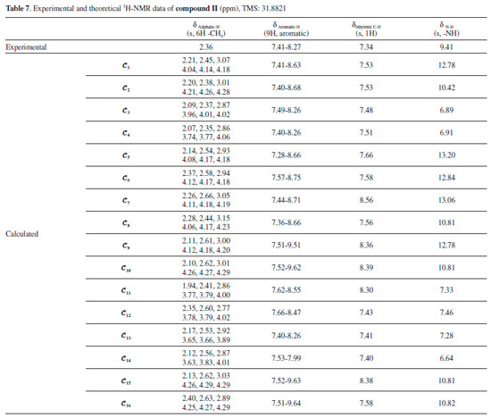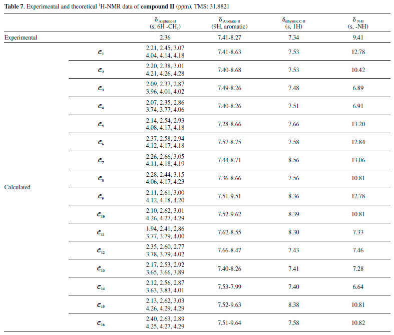 ![]() Figure 13. Experimental and theoretical -NH chemical shifts of a) compound I and b) compound II