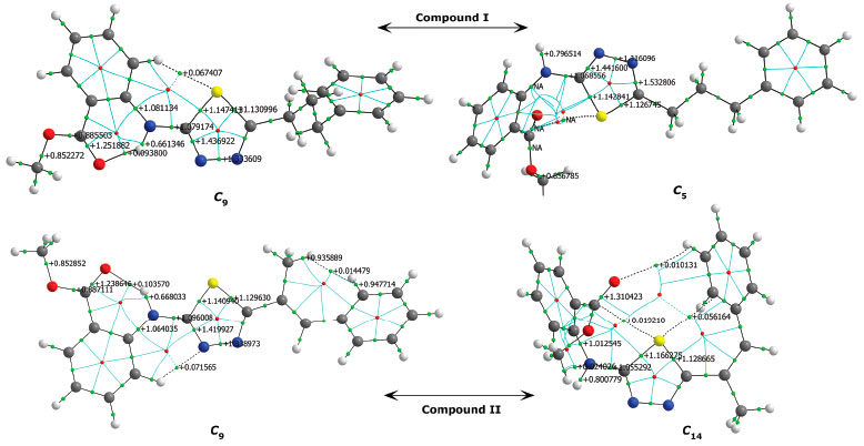 Figure 14. QTAIM visualisation of compound I (𝓒;9, 𝓒;5) and compound II (𝓒;9, 𝓒;14); green points: BCPs, red points: RCPs