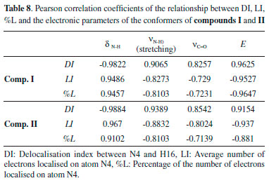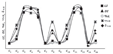 ![]() Figure 15. Representation of the correlation between the LI, DI, %L-N4, ν(N-H) and δ(N-H) of the conformers of compound I (values are scaled)