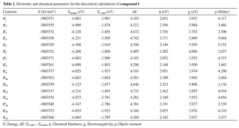 RESULTS AND DISCUSSION The numbers of the atoms in compounds I and II are shown in Figure 3. Although many conformational structures exist, using the dihedral rotors (Dn, n = 1 - 6) shown in Figure 3, only the possible 16 initial conformations of compounds I and II (Figures 4 and 5) with the lowest molecular energy from the obtained structures were considered for theoretical analysis. For structures with similar spatial geometry, as shown in the conformers 𝓒;1, 𝓒;7 and 𝓒;9, 𝓒;15 of compound I and 𝓒;1, 𝓒;5 of compound II, initial geometries were selected to have dihedral angle differences between thiadiazole and aromatic rings, and thus the effects of dihedral angle differences of similar conformer on the optimization results were also examined. As shown in Table 1, the initial geometry of the optimised conformers greatly influenced the minimum molecular energy values (E), HOMO-LUMO eigenvalues, chemical hardness, electronegativity and dipole moments. Although the difference between the calculated minimum molecular energies of the conformers is relatively small, 44 and 89 kJ mol-1 for compounds I and II, respectively, significant differences among other electronic parameters were observed. The calculated minimum molecular energies of the conformer 𝓒;9 of compounds I and II, -3803573 and -3800366 kJ mol-1, respectively, were lower than those of the other conformers. The energies of the conformers whose minimum molecular energies were greater than those of other conformations were calculated as -3803529 kJ mol-1 (𝓒;5) for compound I and -3800277 kJ mol-1 (𝓒;14) for compound II. Differences in the calculated dipole moment values depended on the initial conformations and were observed to be approximately double. For compound I, the dipole moment of the conformers was found to be between 2.136 and 5.151 Debye, and for compound II, it was between 2.126 and 5.133 Debye. Figures 6a and 6b show examples of the HOMO and LUMO energies that were also greatly affected by conformational differences and led to a change in the energy gap ΔE (ΔE = ELUMO - EHOMO). As a result of this situation, many parameters (such as global hardness, global softness and electronegativity) obtained using the HOMO-LUMO values were calculated differently because of the effect of the conformational changes on the HOMO-LUMO energy eigenvalues.