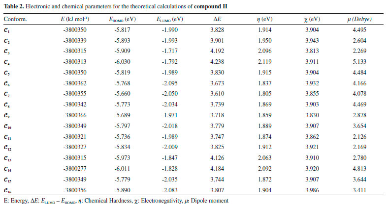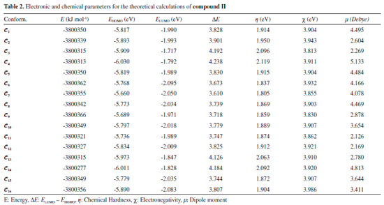 I. Biomedical Engineering Department, Faculty of Engineering and Architecture, Kastamonu University, 37100, Kastamonu, Turkey Recebido em: 10/08/2018 *e-mail: mserdarcavus@kastamonu.edu.tr In this study, new 1,3,4-thiadiazole compounds were synthesised and characterised by FT-IR, 1H-NMR, UV-vis spectroscopy and elemental analysis, Furthermore, the relationship between the electronic and spectral data of the 16 conformers of each compound was investigated by theoretical calculations; the theoretical data were compared with the experimental results. The B3LYP hybrid functional level with a 6-311++g(2d,2p) basis set was used to obtain the ground state geometries, frontier molecular orbital energies, band gap energies and chemical reactivity parameters and to perform a spectral analysis of the compounds. Significant correlations were calculated between the minimum molecular energy and the N-H and C=O vibrational frequencies and the NH proton chemical shifts of the conformers. The charge density on the nitrogen atom and the delocalisation index of the highly polar N-H covalent bond were investigated by quantum theory of atoms in molecules. The effect of conformer structure on the theoretical results and its role in interpreting the experimental data were presented, and it was theoretically shown that the activity degree of the non-aromatic electronegative atoms or groups of atoms in the intramolecular interaction was a very important factor in determining the electronic and spectral properties of each compound. INTRODUCTION Heterocyclic systems containing nitrogen and sulphur atoms have recently become very attractive for therapeutics.1,2 The molecules including the 1,3,4-thiadiazole moiety are used in many applications because they contain two heterocyclic aromatic moieties. Their different derivatives have been used as antimicrobials,3 antifungal,4 antibacterial,5 antileishmanial,6 analgesic, antidepressant,7,8 etc. In this study, 5-[3-phenylypropyl]-N-[2'-methoxycarbonylphenyl]-1,3,4-thiadiazol-2-amine (Compound I) and 5-(1-methyl-2-phenylethenyl)-N-[2'-methoxycarbonylphenyl]-1,3,4-thiadiazol-2-amine (Compound II) were synthesized, and the conformal structures of these compounds were investigated theoretically. The literature contains many reports on the conformational analysis of different molecules, for example, Belaidi et al.9 performed the IR analyses of five conformational structures of butyl methacrylate. Their study focused on the detailed assignment of band intensities and potential energy distribution percentages, and the compatibility between theory and experiment was also examined. The conformational distribution of citronellal by correlating its structure with theoretical chemical shifts based on nuclear magnetic resonance (NMR) data was studied by Nardini et al.10 Okada and Ando11 clarified the relationship between vibrational frequencies of absorption bands in the far-IR region and the local conformations of fully aromatic imides and polyimides. In another study, Bardak et al.12 studied the conformational, interactive, magnetic and electronic properties of isophthalic acid to investigate its effects on human health, toxicology and biodegradability. Ortega et al.13 conducted a comprehensive structural and conformational analysis of the (-) - S-parent as well as an analysis of the electronic structures of different molecular conformations of unnatural species, in an attempt to explain how the conformational stability of the system was controlled by the stereoelectronic effects. Furthermore, density functional theory (DFT) and NMR-based conformational analyses of methyl galactofuranosides were compared by Richards et al.,14 and Galf-specific Karplus-like equations were developed from these conformations. Many experimental studies have been supported by conformational and structural analyses, and structural differences between conformations have been revealed by these analyses. However, conformational analyses have mostly been used to compare experimental and theoretical data and to understand the nature of experimental results.15-23 Here we have considered the question, 'What is the relationship between the electronic and spectral properties of the conformers of a compound, and does the relationship have distinctive characteristics?' We also investigated how molecular conformations affected the minimum molecular energy, frontier molecular orbital (FMO) energies, some electronic parameters such as chemical hardness and electronegativity, and the UV, IR and NMR spectra. Moreover, the importance of choosing appropriate conformers to interpret experimental data was discussed. We also analysed the relation between intramolecular interactions and the minimum energy and showed the influence of intramolecular interactions on the UV, IR and 1H-NMR spectra. The Kohn-Sham DFT24,25 method was used to theoretically investigate the characteristic and spectroscopic properties of the conformers of the synthesised compounds. The molecular structures and FT-IR, UV and 1H-NMR spectra of the conformers were characterised using the B3LYP method with the 6-311++g(2d,2p) basis set. In addition, using the same method, the highest occupied molecular orbital (HOMO), the lowest unoccupied molecular orbital (LUMO) energies, electrostatic potential (ESP) maps and electronic parameters were calculated. Furthermore, quantum theory of atoms in molecules (QTAIM) analysis was performed to determine the intramolecular interactions and any correlations between electron charge distribution, molecular energy and spectral data. An analysis of the data was performed, and the relationship between the electronic and spectral properties of the conformers was studied in detail.