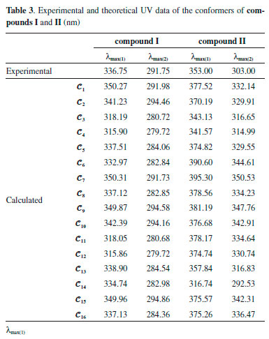 UV analysis of the compounds The UV-visible absorption spectra of 1 x 10-5 mol L-1 solutions of compounds I and II in CHCl3 were recorded between 300 and 700 nm, and their spectral data are summarised in Table 3. The compounds showed two absorption peaks, at 336.75 and 291.75 nm for compound I and at 353.00 and 303.00 nm for compound II. UV-vis absorption bands are thought to originate from π-π* and n-π* electronic transitions in the structures of the compounds. However, the theoretical calculations showed that the UV absorptions of the conformers displayed different characteristics. Figure 8 shows the experimental and calculated UV spectra of six selected conformations for compound I.