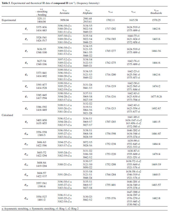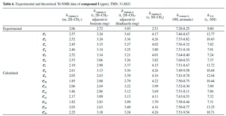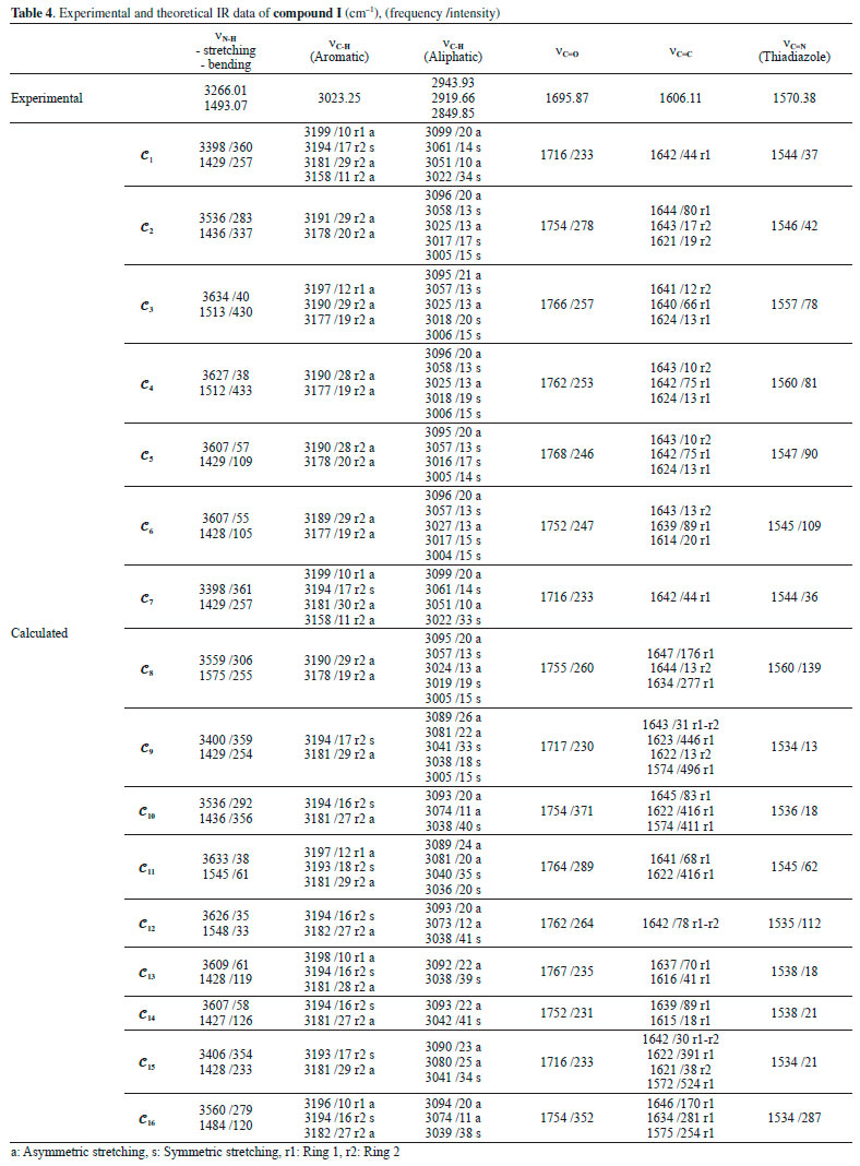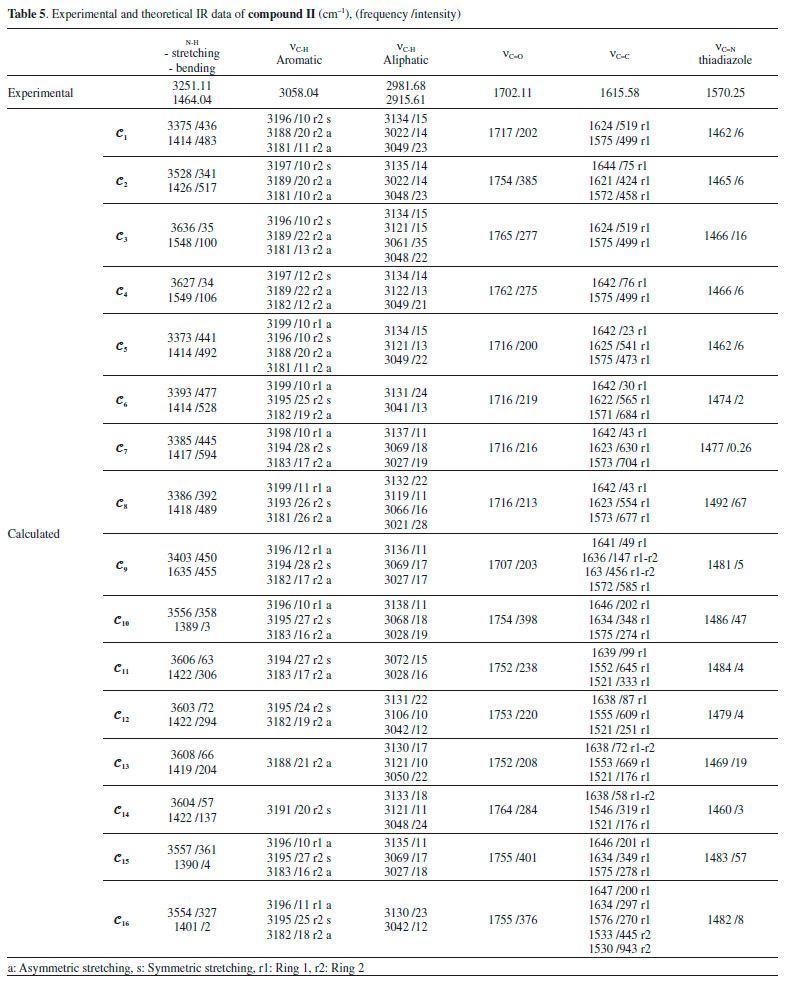 IR analysis of the compounds The IR spectra of the compounds were monitored between 4000 and 200 cm-1 using an Alpha FT-IR spectrometer (Bruker, Germany). The IR absorptions of compounds I and compound II were observed as follows: vibration of N-H groups at 3266.01 and 3251.11 cm-1, stretching vibration of aromatic C-H at 3023.25 and 3058.04 cm-1, stretching vibration of aliphatic C-H at 2943.93-2981.68 cm-1, stretching vibration of C=O at 1695.87 and 1702.11 cm-1, stretching vibration of C=C at 1606.11 and 1615.58 cm-1 and stretching vibration of C=N (thiadiazole) at 1570.38 and 1570.25 cm-1. The experimental and theoretical IR data of compound I and compound II are given in Tables 4 and 5. The experimental IR spectra showed that the observed bands are compatible with the structures of the compounds. Moreover, the effects of molecular conformation on the vibrational frequencies of N-H (stretching and bending), C-H (aromatic and aliphatic), C=O, C=C and C=N were also studied theoretically, and the results were compared with the experimental data. N-H and C=O vibrations gave distinctive peaks, which were investigated to analyse the effects of the conformations on the vibration frequencies. The N-H stretching and bending vibrational frequencies of the conformers of compound I were experimentally found to be 3266.01 and 1493.07 cm-1, respectively. The theoretical results showed that the stretching frequencies were in the range 3398-3634 cm-1 and the N-H bending frequencies were in the range 1427-1575 cm-1. The calculated vibrations of the aromatic C-H peaks were observed in the range 3199-3180 cm-1 and were generally not greatly affected by any conformational changes. Similar situations were also observed for aliphatic C-H (experimentally 2850-2944 cm-1 and theoretically 3004-3099 cm-1) and C=C (experimentally 1606 cm-1 and theoretically 1572-1647 cm-1) vibrations. The vibrational frequencies of the electronegative-atom-bearing groups, O-H and N-H, were more affected by conformational changes.