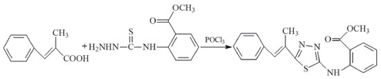 5-(1-methyl-2-phenylethenyl)-N-[2'-methoxycarbonylphenyl]-1,3,4-thiadiazol-2-amine (compound II) The synthesis route of compound II is presented in Figure 2. 4-phenylbutyric acid (3.51 g, 10 mmol) and N-(2-methoxycarbonylphenyl)thiosemicarbazide(1.67 g, 10.0 mmol) were used as the raw materials instead. The same procedures in the synthesis of compound I were performed. (Yield: 71%, melting point: 197 °C). Elemental analysis (C19H17N3O2S): theoretical (%): C, 64.94; H, 4.88; N, 11.96; experimental (%): C, 64.94; H, 3.85; N, 11.76.