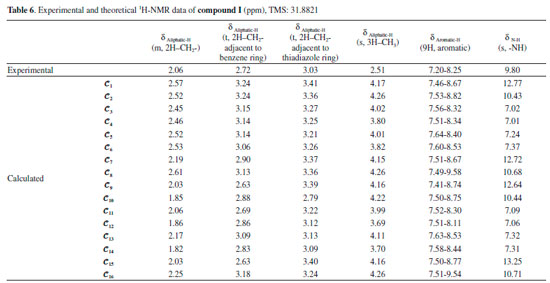 Moreover, it was shown that there was also a relationship between the N-H and C=O vibrational frequencies and the minimum molecular energies of the compounds: The conformers 𝓒;1, 𝓒;7, 𝓒;9 and 𝓒;15 of compound I have lower molecular energies, and the N-H and C=O frequencies of these conformers are also closer to the experimental results. A similar situation applies to the conformers 𝓒;1, 𝓒;5, 𝓒;6, 𝓒;7, 𝓒;8 and 𝓒;9 of compound II. However, although the UV absorption peaks of conformers 𝓒;1, 𝓒;7, 𝓒;9 and 𝓒;15 of compound I are not the most compatible with the experimental data, their vibrational frequencies are more consistent with the experimental results. A similar situation applies to the compatibility of the calculated UV and IR spectra of compound II with the experiments. This uncertainty leads to the next phase of theoretical analysis; the relationship between the spectral and electronic data of the compounds will be examined by 1H-NMR and QTAIM analyses. NMR analysis of the compounds The NMR spectra of all of the compounds were obtained using a Bruker spectrometer (400 MHz) at room temperature in DMSO-d6. All of the 1H-NMR data are listed in Tables 6 and 7. The aliphatic protons of the compounds were observed between 2.06 and 3.03 ppm, the aromatic protons of the compounds were observed between 7.20 and 8.27 ppm, and the NH protons of the compounds were observed between 9.41 and 9.80 ppm. The 1H-NMR spectra show that the observed peaks are compatible with the protons of the compounds.