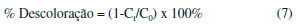Para avaliar a descoloraçao dos corantes foram realizadas reaçoes em cubetas de quartzo de 3 mL contendo 450 µmol L-1 de H2O2, 1 mmol L-1 de H2SO4 (para ajustar o pH na faixa ideal entre 2,5 e 3,0 para evitar precipitaçao de ferro - medido com o auxílio de um pHmetro), 30 µmol L-1 de corante e 30 µmol L-1 de Fe(NO3)3 ou FeSO4 para iniciar os tratamentos baseados nas reaçoes tipo Fenton ou Fenton clássica, respectivamente. Quando realizados os experimentos na presença de mediadores fenólicos nas reaçoes tipo Fenton, soluçoes contendo os mesmos foram adicionadas ao meio reacional para uma concentraçao final de 10 µmol L-1. Nenhum dos reagentes foi adicionado ao longo do tempo reacional. O volume final para cada reaçao correspondeu a 2 mL. Leituras de absorbância foram realizadas no comprimento de onda máximo característico de cada corante (435, 513 e 665 nm, para o vermelho de fenol, cromotrope 2R e azul de metileno, respectivamente) por meio de um espectrofotômetro Libra S50 (Biochrom). A descoloraçao dos corantes foi monitorada após 5, 10, 20, 40 e 60 min. Preparou-se o branco isento de corantes e sais de ferro. Os ensaios foram realizados em duplicata, ao abrigo da luz e à temperatura ambiente. Mais detalhes das condiçoes experimentais estao reportados em Barreto et al.15 As porcentagens de descoloraçao dos corantes foram determinadas conforme Equaçao 7: ![]() sendo C0 e Ct as concentraçoes inicial e no tempo t do corante, respectivamente. As concentraçoes residuais dos corantes foram determinadas com o auxílio de curvas de calibraçao preparadas na presença de 1 mmol L-1 de H2SO4, para evitar alteraçoes no comprimento de onda máximo de cada corante. Com o intuito de se avaliar a influência dos mediadores fenólicos nas reaçoes de descoloraçao, realizou-se um estudo cinético a partir dos modelos de 1ª e 2ª ordens conforme Equaçoes 8 e 9, respectivamente,19 além do modelo desenvolvido por Behnajady, Modirshahla e Ghanbary - modelo BMG,20 conforme Equaçao 10: ![]() sendo k1 e k2 as constantes cinéticas obtidas para os modelos de 1ª e 2ª ordens. Os valores de tempo de meia vida (t1/2) também foram calculados para os dois modelos. A partir das duas constantes características do modelo BMG, m e b, pôde-se calcular seus inversos para estimar a velocidade inicial (1/m) e a capacidade oxidativa (1/b) das reaçoes, respectivamente.20 As unidades de todas as constantes estao descritas nas Tabelas 1 e 2, exceto b que é adimensional.