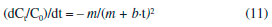 Os valores de k, r2 e t1/2 obtidos a partir dos modelos de 1ª e 2ªordens estao mostrados na Tabela 1 para os três corantes avaliados. Os valores médios de r2 foram calculados, pois eles podem indicar qual é o modelo cinético mais apropriado para um determinado conjunto de reaçoes.21,22 Para o corante vermelho de fenol, a reaçao Fe3+/H2O2 foi descrita pelos modelos de 1ª e 2ª ordens, enquanto o oposto foi observado para Fe2+/H2O2 (valores de r2 inferiores a 0,54). As reaçoes Fe3+/H2O2/mediadores fenólicos também foram bem descritas pelo modelo de 1ªordem, mas melhor descritas pelo de 2ª ordem baseado nos valores médios de r2. Os mediadores aceleraram a descoloraçao desse corante com base nos aumentos de k1 e k2. Como nao houve descoloraçao do vermelho de fenol por Fe3+/H2O2 na presença do ácido 2,4-DHB, nao foi possível fazer um estudo cinético dessa reaçao. Esse fenol é o único que nao possui propriedades redutoras dentre os seis estudados. Seus isômeros com propriedades redutoras, os ácidos 2,3- e 2,5-DHBs, foram os mais efetivos com base nos maiores valores de k1 , k2 e nas porcentagens de descoloraçao após 60 min. Para os valores de t1/2, verificou-se reduçao de 22 vezes nesse parâmetro para Fe2+/H2O2 em relaçao à reaçao Fe3+/H2O2. Esses resultados sao esperados, pois a reaçao de Fenton gera diretamente radicais HO e em maior quantidade em comparaçao à reaçao tipo Fenton, a qual depende da reduçao lenta de Fe3+ por H2O2.4,5 A utilizaçao dos mediadores, exceto o ácido 2,4-DHB, reduziu cerca de 90% no t1/2 ao comparar com a reaçao na ausência deles (Fe3+/H2O2). Importante mencionar também que as reaçoes Fe3+/H2O2 na presença dos ácidos 2,3- e 2,5-DHBs podem ser bem mais efetivas que Fe2+/H2O2 para descolorir o vermelho de fenol, de acordo com os parâmetros cinéticos calculados. Considerando os dados de descoloraçao do corante cromotrope 2R, os modelos de 1ª e 2ª ordens apresentaram valores de r2 inferiores a 0,9 para Fe3+/H2O2, enquanto o de 2ª ordem foi adequado para Fe2+/H2O2. Os valores de k1 e k2 para Fe3+/H2O2/mediadores fenólicos foram superiores, inclusive ao comparar com a reaçao de Fenton clássica, e promoveram maior descoloraçao do corante. O ácido 2,5-DHB também foi o mais efetivo para descolorir esse corante, pois na presença dele foram observados maiores valores de k. Menores valores de t1/2 foram observados para Fe2+/H2O2 em relaçao ao Fe3+/H2O2 também para esse corante. Na presença de mediadores o t1/2 foi aproximadamente 9 vezes menor para o modelo de 1ª ordem e 43 vezes menor para o modelo de 2ª ordem em relaçao à reaçao sem mediadores. Ao comparar com a reaçao de Fenton clássica, as reaçoes Fe3+/H2O2/mediadores fenólicos também resultaram consideravelmente em menores t1/2, baseando-se nesses dois modelos cinéticos. A reaçao com o ácido 2,4-DHB permitiu aumentar os valores de k1 e k2, assim como diminuir o t1/2 somente para o corante cromotrope 2R. Por apresentar seus grupos hidroxila meta orientados (um grupo OH em relaçao ao outro no anel aromático), esse composto nao reduz Fe3+. Contrariamente, os outros mediadores possuem propriedades redutoras, pois seus grupos hidroxila estao orientados nas posiçoes orto ou para, podendo reduzir Fe3+ e serem oxidados em suas respectivas quinonas.23 Todavia, o ácido 2,4-DHB pode ser hidroxilado por radicais HO durante os ensaios, sendo convertido em compostos para- ou orto-di-hidroxiaromáticos com propriedades redutoras.11,15 Em um estudo anterior, Chen et al. observaram que o ácido salicílico (2-hidroxibenzóico) apresentou propriedades pro-oxidantes ao ser hidroxilado durante a descoloraçao do corante verde de malaquita por Fe3+/H2O2.24 Para o azul de metileno, a reaçao Fe2+/H2O2 se adequou muito bem ao modelo de 1ª ordem, corroborando a literatura.25-27 Os sistemas reacionais Fe3+/H2O2/mediadores fenólicos redutores foram melhor descritos pelo modelo de 2ª ordem, enquanto o valor médio de r2 para 1ª ordem foi inferior a 0,9. Os valores de k1 e k2 tiveram incrementos na presença dos mediadores. O modelo de 2ª ordem nao foi apropriado para as reaçoes Fe3+/H2O2 e Fe3+/H2O2/ácido 2,4-DHB (r² inferior a 0,8). Nas reaçoes contendo os mediadores redutores, para ambos os modelos, os tempos de meia vida apresentaram valores próximos ao da reaçao Fe2+/H2O2. Os menores valores de t1/2 foram observados para as reaçoes contendo os ácidos 2,3- e 2,5-DHBs. A presença do ácido 2,4-DHB praticamente nao afetou de forma significativa os valores de k1, k2 e t1/2. Entretanto, a descoloraçao desse corante por todas as reaçoes atingiu valores superiores a 90%, inclusive na presença do ácido 2,4-DHB. Esses aspectos podem ser devido à alta suscetibilidade desse corante ao ataque por radicais HO,7 dificultando a diferenciaçao das reaçoes em funçao da porcentagem de descoloraçao após 60 min. Porém, com base nesses dois modelos cinéticos, foi possível verificar de forma mais clara o efeito pro-oxidante de compostos redutores de Fe3+ na descoloraçao do azul de metileno. Quanto ao terceiro modelo avaliado no presente trabalho, BMG, sua sigla foi criada em funçao das iniciais dos três autores que o utilizaram pela primeira vez em reaçoes para descolorir um corante por reaçao de Fenton.20 A tangente da curva de decréscimo em um determinado tempo para o modelo BMG pode ser obtida ao derivar a Equaçao 10, resultando na Equaçao 11: ![]() Dessa forma, quanto maior for 1/m (na condiçao em que t se aproxima de 0), mais rápida será a razao de decréscimo do corante. Sendo assim, 1/m indica a velocidade inicial de descoloraçao do corante. Quando o tempo for alto e tender ao infinito, o inverso de b (1/b) indica a fraçao máxima teórica de remoçao, a qual equivale à capacidade máxima de oxidaçao do sistema ao final da reaçao. A Figura 3 mostra as curvas obtidas a partir do modelo BMG para a descoloraçao do cromotrope 2R pelos sistemas F