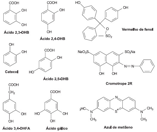 PARTE EXPERIMENTAL Os reagentes utilizados nesse estudo foram de grau analítico e obtidos de diferentes fornecedores: cromotrope 2R e os ácidos 2,3-, 2,4-, 2,5-DHBs e 3,4-DHFA foram obtidos da Sigma-Aldrich (Milwaukee WI, Estados Unidos); catecol da Fluka Chemie (Buchs, Suiça); Fe(NO3)3, ácido gálico, vermelho de fenol e H2O2 (30% m/m) da Vetec Química (Rio de Janeiro, Brasil). Acido sulfúrico e azul de metileno foram obtidos de outros fornecedores, mas também de grau analítico. As soluçoes foram preparadas com o uso de água deionizada e depois armazenadas adequadamente, com exceçao das soluçoes de mediadores fenólicos que eram preparadas e usadas no mesmo dia, enquanto as soluçoes de sais de ferro eram preparadas imediatamente antes do uso, com o intuito de minimizar a alteraçao do estado de oxidaçao desse metal. As estruturas químicas dos cinco di-hidroxibenzenos e do ácido gálico, assim como as dos corantes, estao mostradas na Figura 1.