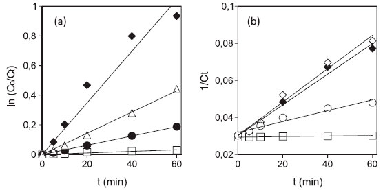 ![]() Figura 2. Curvas obtidas para a descoloraçao do corante vermelho de fenol a partir do modelo de 1a ordem (a) por: Fe3+/H2O2 (□), Fe3+/H2O2/catecol (), Fe3+/H2O2/ácido 3,4-DHFA (Δ) e Fe3+/H2O2/ácido 2,5-DHB (♦) e; a partir do modelo de 2a ordem (b) por: Fe3+/H2O2 (□), Fe3+/H2O2/ácido gálico (○), Fe3+/ H2O2/ácido 2,5-DHB (♦) e Fe3+/H2O2/ácido 2,3-DHB (◊). [H2O2] = 450 μmol L-1; [corante] = 30 μmol L-1; [mediador fenólico] = 10 μmol L-1; pH = 2,5-3,0