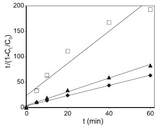 ![]() Figura 3. Curvas obtidas para o modelo BMG a partir de dados de descoloraçao do corante cromotrope 2R por: Fe3+/H2O2/ácido 2,5-DHB (♦), Fe2+/ H2O2 (▲) e Fe3+/H2O2 (□)