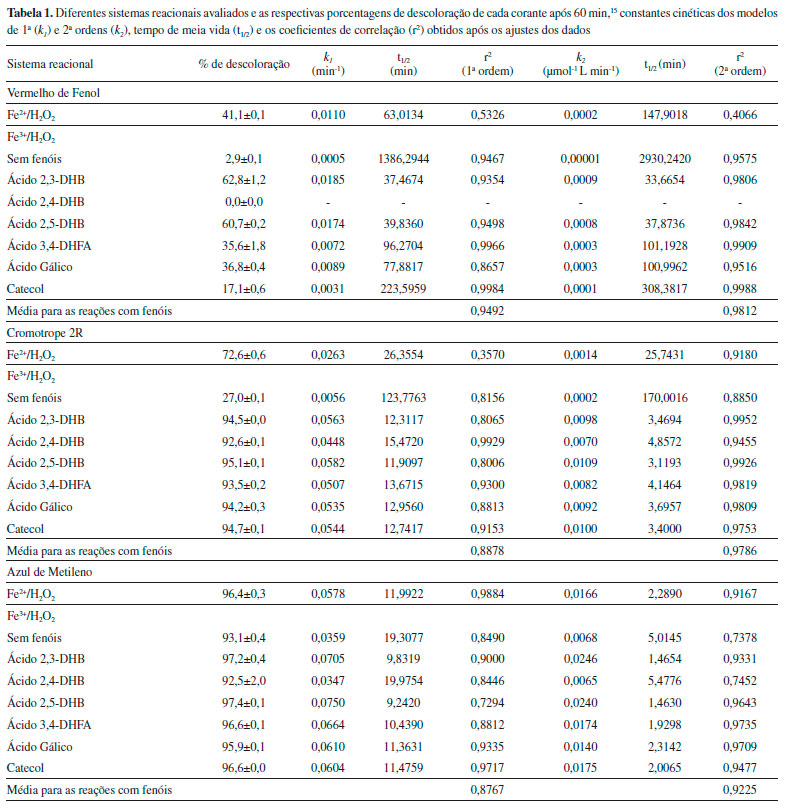 Apesar de o presente trabalho avaliar o efeito de mediadores fenólicos com propriedades redutoras (exceto o ácido 2,4-DHB), os corantes e outros poluentes orgânicos utilizados como alvos podem ser convertidos por radicais HO em intermediários redutores ao longo do tempo reacional, independente da adiçao de fenóis. A degradaçao de fenol, 4-clorofenol e 4-nitrofenol por Fe3+/H2O2 foi acompanhada pela geraçao de intermediários di-hidroxilados redutores.36 Por outro lado, em um estudo recente envolvendo diferentes sistemas Fenton, a degradaçao de fenol foi incrementada com a adiçao de catecol e hidroquinona (1,4-di-hidroxibenzeno), mesmo esses dois tendo sido gerados a partir da hidroxilaçao da molécula alvo durante as reaçoes.17 Por ser um corante muito estudado, produtos de degradaçao por radicais HO do azul de metileno sao frequentemente reportados,26,37 os quais podem apresentar propriedades redutoras. Embora ele nao possua nenhum grupo OH fenólico, em um estudo anterior do nosso grupo, a presença do azul de metileno aumentou a descoloraçao do azocorante Pardo Bismarck Y.11 Sugeriu-se que o azul de metileno possa ter sido convertido em intermediários fenólicos redutores. Para os outros corantes, essa observaçao também pode ser válida. Com exceçao do ácido 2,4-DHB, o qual foi o menos efetivo mediador por nao possuir propriedades redutoras, nao foi possível correlacionar a estrutura química dos outros fenóis com suas propriedades pro-oxidantes. Por exemplo, as reaçoes na presença dos compostos redutores contendo grupo carboxila apresentaram maiores valores de k em comparaçao ao catecol para descolorir o vermelho de fenol. No entanto, o catecol foi um dos mais efetivos mediadores para descolorir os outros dois corantes. Mesmo o ácido gálico possuindo três hidroxilas fenólicas vicinais, grupo funcional envolvido na reduçao de Fe3+,4 os ácidos 2,3- e 2,5-DHBs foram os mais efetivos. É muito importante mencionar que a adiçao de mediadores fenólicos em sistemas Fenton nao é algo simples para o tratamento de efluentes reais, pois o custo desses compostos tornaria esse propósito inviável. Uma alternativa promissora para obtê-los seria utilizar soluçoes contendo-os e que sejam de fácil disponibilidade. Extratos aquosos de madeira,38 assim como um efluente real contendo compostos similares,10 incrementaram a degradaçao de diferentes poluentes orgânicos em sistemas Fenton. Além disso, a toxicidade e a biodegradabilidade desses compostos devem também ser consideradas, caso o efluente tratado seja disposto em corpos receptores e que ainda contenha parte desses fenóis que foram adicionados. Nesse sentido, cabe mencionar que ao reagir com Fe3+, eles sao degradados e até mesmo mineralizados,23 sendo isso algo desejável para aplicaçao real.