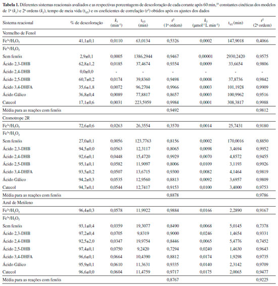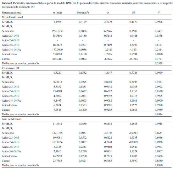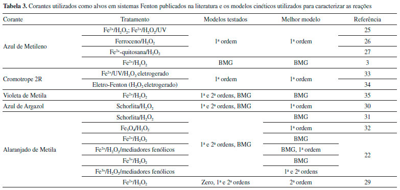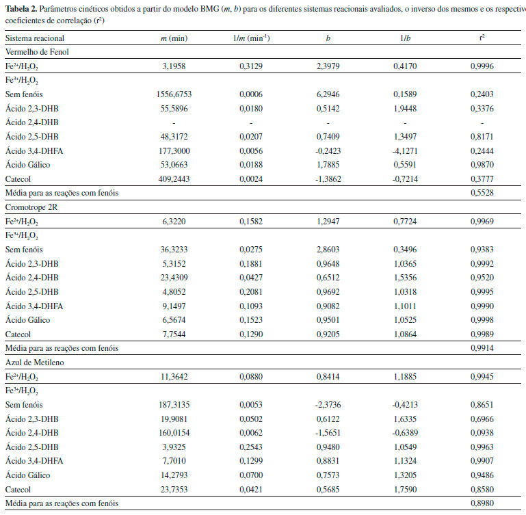 CONCLUSOES Ao comparar os presentes resultados com vários estudos da literatura, o modelo cinético BMG é o que melhor descreve a reaçao de Fenton clássica para descolorir corantes de diferentes classes. Por outro lado, as reaçoes contendo Fe3+ se adequaram melhor ao modelo de 2ª ordem de forma geral, sendo que na presença dos mediadores fenólicos foram observados incrementos nos valores de k2 e como consequência a diminuiçao nos valores de t1/2. Esses aspectos demonstram que os mediadores aceleraram as reaçoes de descoloraçao dos três corantes estudados, com exceçao do único mediador nao redutor, o ácido 2,4-DHB. Esse último apenas apresentou propriedades pro-oxidantes na descoloraçao do cromotrope 2R. Ainda com base no modelo BMG, a presença dos mediadores fenólicos permitiu incrementos na capacidade oxidativa, assim como na velocidade inicial de descoloraçao, principalmente para o cromotrope 2R, corante cuja descoloraçao foi a que melhor se ajustou a esse modelo, independente do estado inicial de oxidaçao do ferro nos ensaios. Com isso, os três modelos cinéticos permitiram verificar propriedades pro-oxidantes dos mediadores fenólicos. Pode-se corroborar com a literatura que a descoloraçao oxidativa de corantes por sistemas Fenton pode ser representada por diferentes modelos, sendo influenciada pelo tipo de catalisador, presença ou nao de mediador fenólico, assim como da estrutura química do corante alvo.