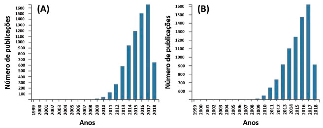 Figura 1. Resultados da busca de trabalhos na plataforma Web of Science, usando como palavras chaves "silver nanoparticles" e "toxicology" (A) e resultados da busca de trabalhos usando como palavras chaves "AgNPs" e "nanotoxicology" (B). Data da busca: 12 junho de 2018