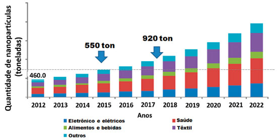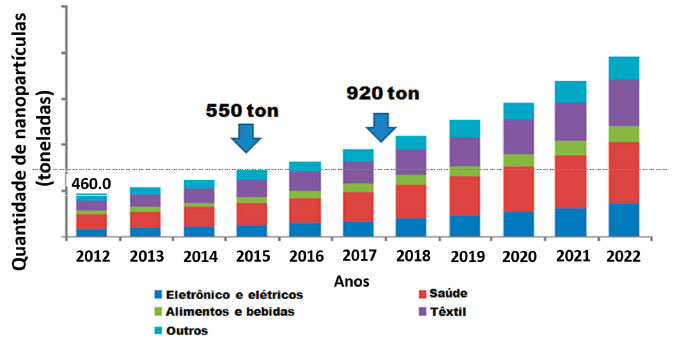 A Figura 2 apresenta uma tendência do Mercado Global baseado uso de NPs de Ag em aplicaçoes eletroeletrônicas, na área da saúde, das indústrias de alimentos, bebidas e têxtil. O mercado global de NPs de Ag foi analisado desde 2012 com perspectivas até 2022, destacando a utilizaçao em toneladas dessas nanopartículas. (Publicado: Maio 2015, ISBN Code: 978-1-68038-413-0 (http://www.grandviewresearch.com/industry-analysis/silver-nanoparticles-market) (Figura 2). Uma análise importante foi realizada pela "Scientific Committee on Emerging and Newly Identified Health Risks" (SCENIHR) mostrando que as NPs de Ag sao utilizadas em aproximadamente 243 produtos comerciais.18