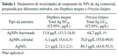 PARAMETROS IMPORTANTES QUE INFLUENCIAM A TOXICIDADE DAS NPS DE AG Cada nanopartícula (incluindo-se outras nanopartículas além das NPs de Ag) é única, em funçao da sua rota de preparaçao, tamanho, estado de agregaçao, estabilidade em meio biológico, natureza química do revestimento, carga superficial, etc. Destaca-se que tal variabilidade no processo de síntese de nanopartículas, incluindo as NPs de Ag, poderia ser um problema para o uso comercial das mesmas. O controle nos parâmetros de síntese de NPs de Ag é necessário para garantir a reprodutibilidade de sua produçao. Nesse sentido, nesta seçao serao abordados alguns fatores importantes que influenciam a toxicidade das NPs de Ag em células de humanos e animais. Preparaçao da suspensao Park et al.39 avaliaram a toxicidade de uma suspensao comercial de NPs de Ag recobertas com citrato de sódio, preparada a partir de diferentes métodos. Os resultados mostram que a suspensao fracionada (agitada e sedimentada) foi menos tóxica para o organismo aquático modelo Daphnia (13,8 µg L-1), em comparaçao com a suspensao coloidal (6.1 µg L-1) sem tratamento algum, sugerindo que o método de preparaçao da suspensao de NPs de Ag foi um fator crítico na determinaçao da toxicidade das nanopartículas (Tabela 1).