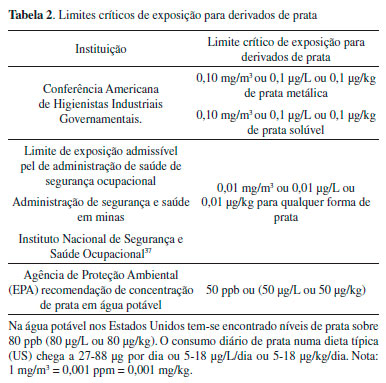 LIMITES CRITICOS DE EXPOSIÇAO Os limites de exposiçao de componentes de prata nos Estados Unidos mostraram valores variados dependendo da fonte de informaçao, como mostrado na Tabela 2. Entretanto, no Brasil, a legislaçao estabelece nas águas potáveis um limite de 0,010 mg L-1 ou 10 µg L-1 de (Ag total).49
